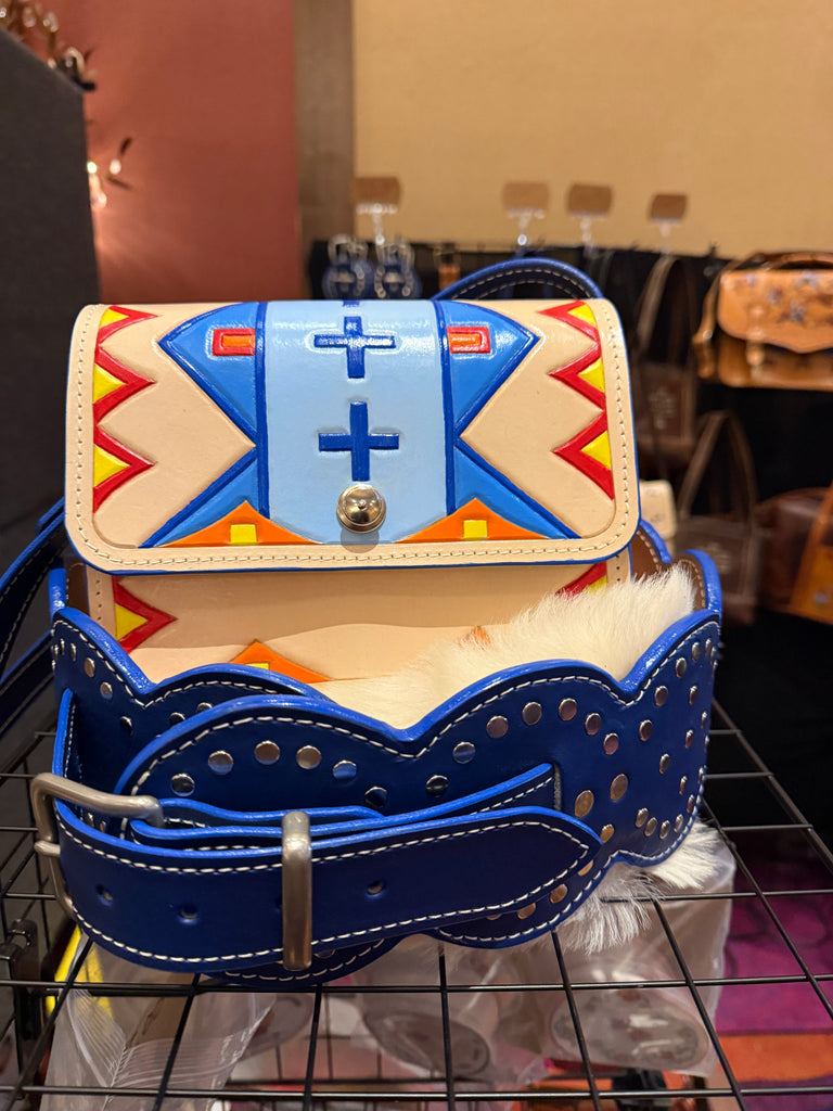 This compact beauty from our “Jus Cute” line features a Parfleche design, hand-tooled on premium vegetable-tanned leather. The gusset and strap are made from durable bridle leather, giving it a sturdy yet stylish finish.